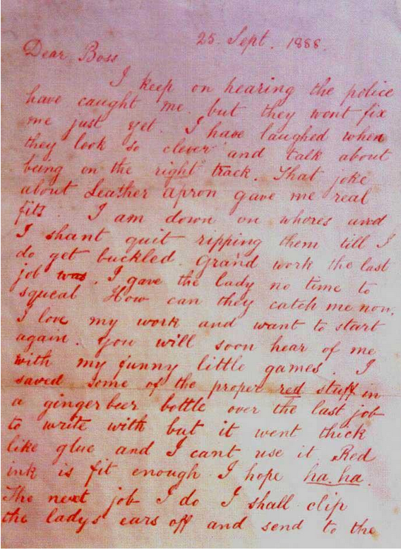 I keep on hearing the police have caught me but they wont fix me just yet. I have laughed when they look so clever and talk about being on the right track. That joke about Leather Apron gave me real fits. I am down on whores and I shant quit ripping them till I do get buckled. Grand work the last job was. I gave the lady no time to squeal. How can they catch me now. I love my work and want to start again. You will soon hear of me with my funny little games. I saved some of the proper red stuff in a ginger beer bottle over the last job to write with but it went thick like glue and I cant use it. Red ink is fit enough I hope ha. ha. The next job I do I shall clip the ladys ears off and send to the police officers just for jolly wouldn’t you. Keep this letter back till I do a bit more work, then give it out straight. My knife’s so nice and sharp I want to get to work right away if I get a chance. Good Luck.