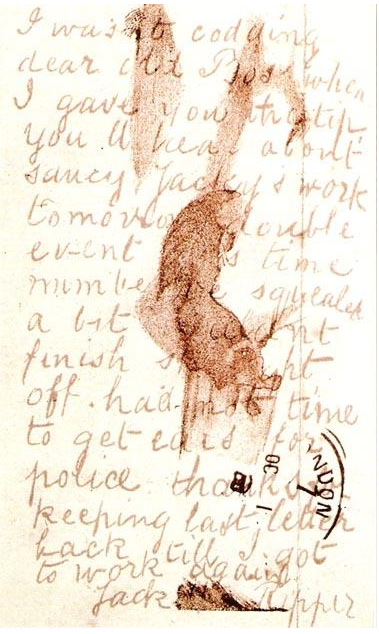 “I was not codding dear old Boss when I gave you the tip, you’ll hear about Saucy Jacky’s work tomorrow double event this time number one squealed a bit couldn’t finish straight off. ha not the time to get ears for police. thanks for keeping last letter back till I got to work again.